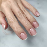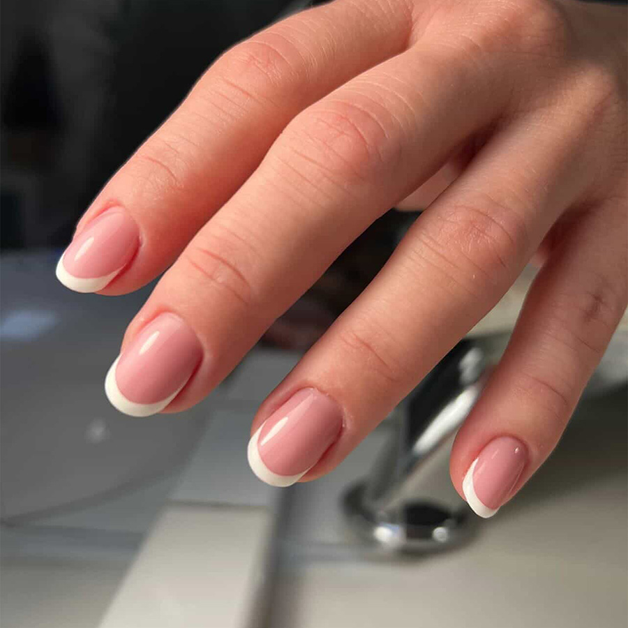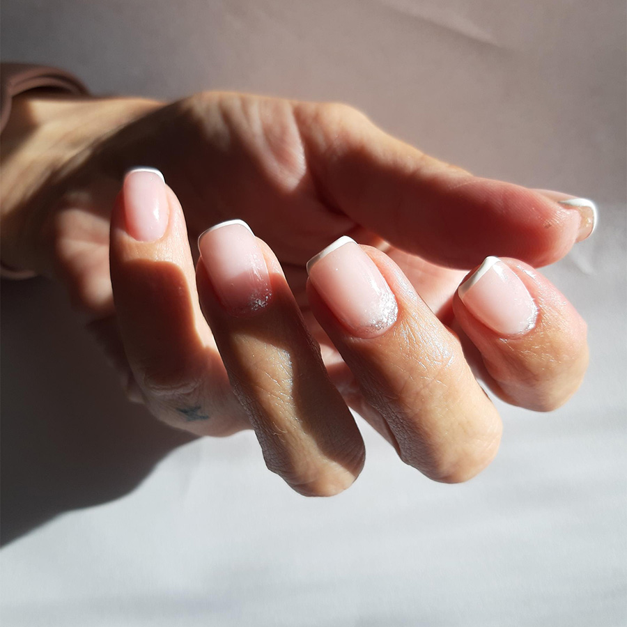 Jedna z největších výhod micro French je, že skvěle funguje i na kratších nehtech. Klasická francie může na kratší délce působit těžce nebo opticky nehet zkrátit. Micro French je naopak jemná a vyvážená.