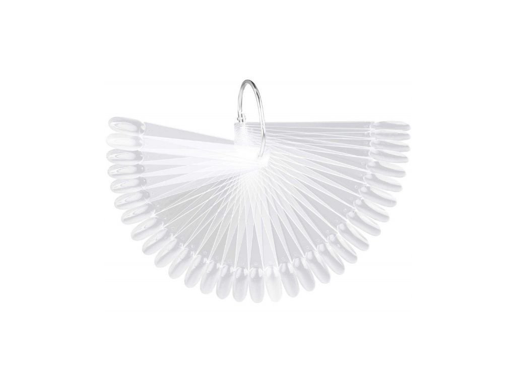 Transparentní vzorník Oval Tips Display Ring s 50 oválnými tipy je ideální pro prezentaci barev, gelů, gel-laků či zdobení. Čiré provedení umožňuje realistickou ukázku barev přímo na podkladu, který připomíná přírodní nehet. Tipy jsou umístěny na ocelovém kroužku, lze je snadno vyjmout a opět nasadit.